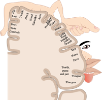 The image above is known at the ‘cortical homunculus’. This homunculus is a sensory map within the brain. The larger the body part on the map, the more sensitive the body part is. The body also has a cortical homunculus for motor processing. This map is for the movements of the body, and the thumb is also well represented on this map (not pictured).